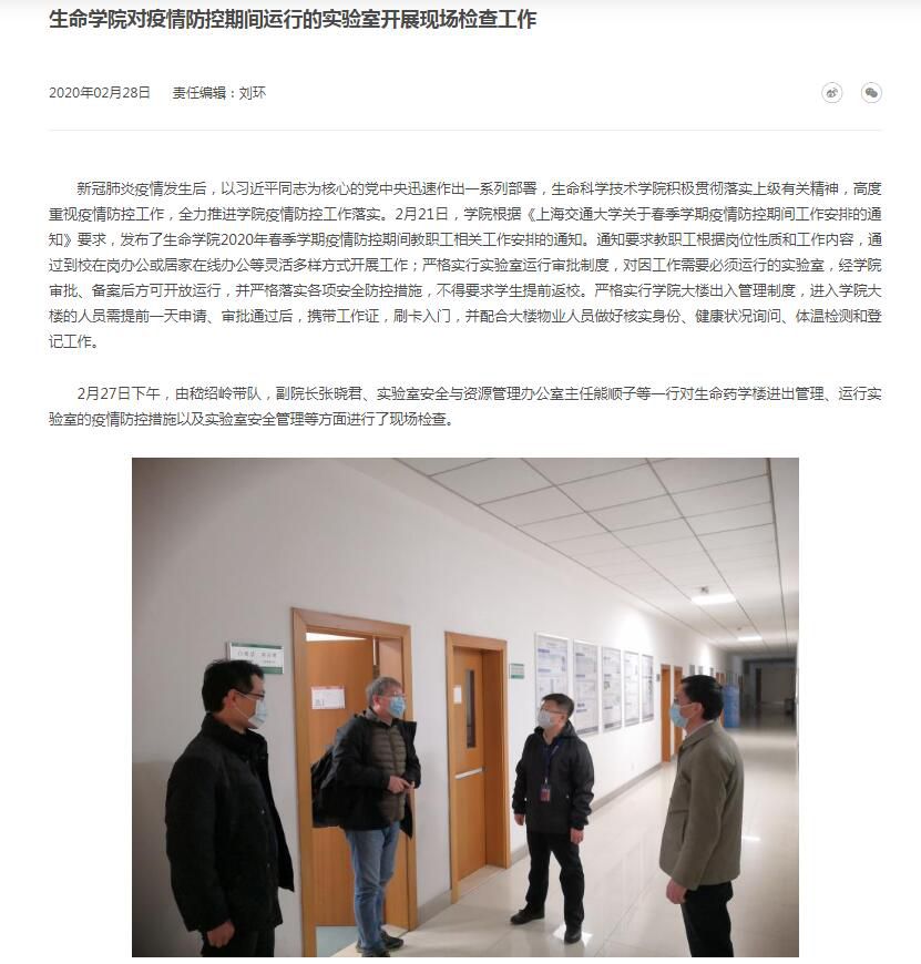 1,2月27日下午,由嵇紹嶺帶隊(duì),副院長(zhǎng)張曉君、實(shí)驗(yàn)室安全與資源管理辦公室主任熊順子等一行對(duì)生命藥學(xué)樓進(jìn)出管理、運(yùn)行實(shí)驗(yàn)室的疫情防控措施以及實(shí)驗(yàn)室安全管理等方面進(jìn)行了現(xiàn)場(chǎng)檢查。