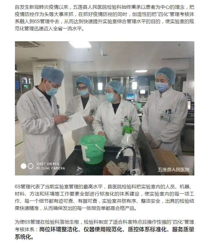 2,自發(fā)生新冠肺炎疫情以來(lái),五蓮縣人民醫(yī)院檢驗(yàn)科始終秉承以患者為中心的理念,把疫情防控作為頭等大事來(lái)抓,在抓好疫情防控的同時(shí),創(chuàng)造性的把“四化”管理考核體系融入到6S管理中去,從而達(dá)到快速提升實(shí)驗(yàn)室綜合管理水平的目的,使實(shí)驗(yàn)室的規(guī)范化管理迅速邁入全省一流水平。