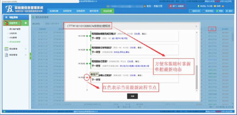 方便客服隨時掌握單據(jù)最新動態(tài),委托信息管理流程如下:報告編制完成確認 -> 測報告已簽發(fā) -> 檢測報告確認發(fā)放.